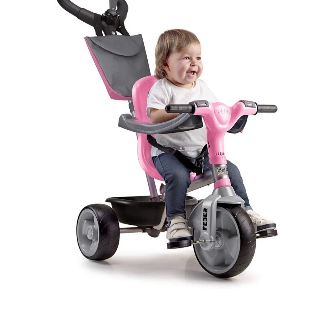 Triciclo bebe marca Febber con estructura metálica y cinturón de seguridad, 2 posiciones, silla de empuje y mando para música con altavoz , apto para niños de+9 meses